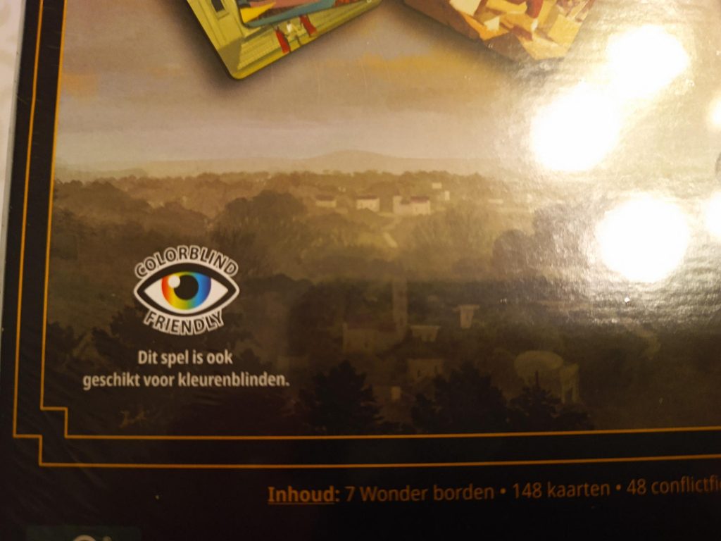 Ook deze maand aandacht voor een spel: 7 Wonders. Hierbij wordt op de doos expliciet aangegeven dat het spel geschikt is gemaakt voor mensen met een kleurzin-stoornis. Top!